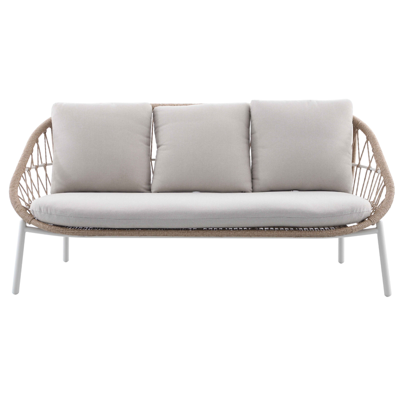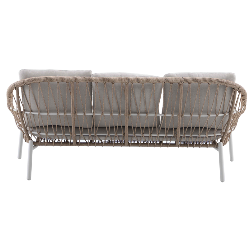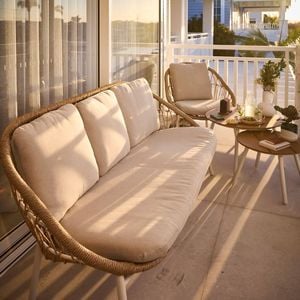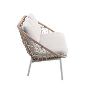 It features gracefully curved and complemented by a olifen cushion for added comfort. Constructed with a robust metal frame and in durable PE rattan wicker, it combines style with lasting durability