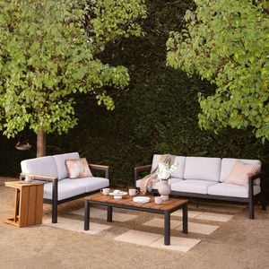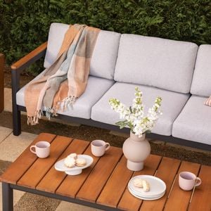 The sofa table pairs a sleek dark aluminum frame with natural hardwood slats for a timeless, minimalist look. Sturdy and durable, it’s the perfect all-season addition to any outdoor setting.